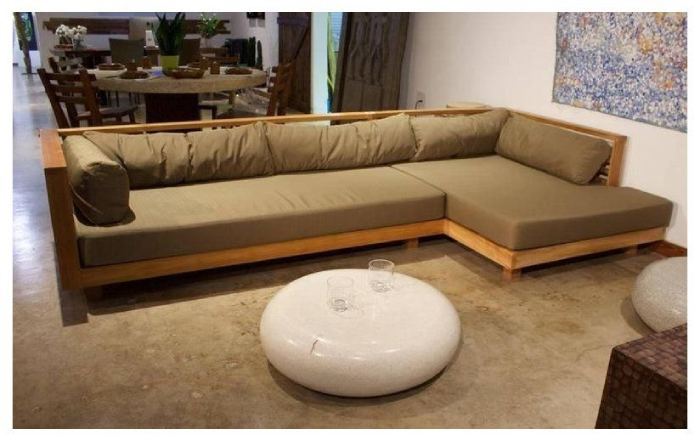 Mẫu sofa gỗ dáng chữ L bằng gỗ nguyên khối cũng là một trong top đầu lựa chọn cho phòng khách. Tận dụng được góc kê chữ L, quý gia chủ có thể tiết kiệm tối đa không gian mà vẫn đảm bảo sự tiện nghi của ngôi nhà.